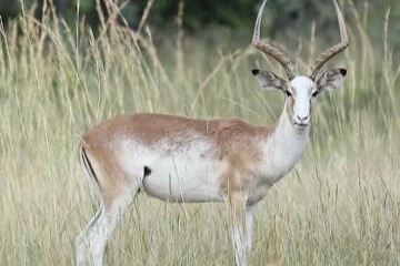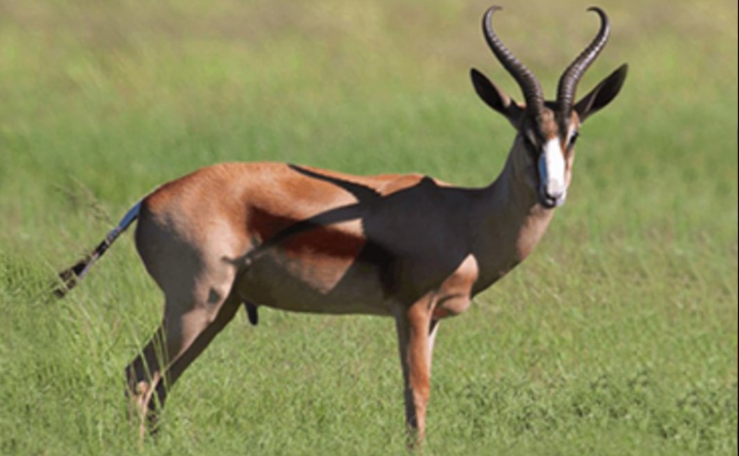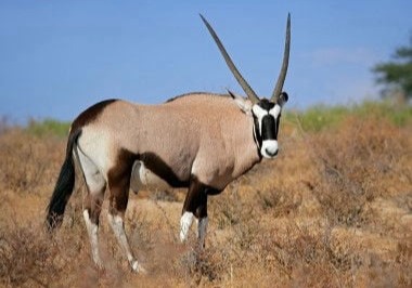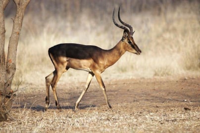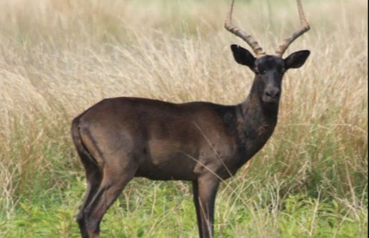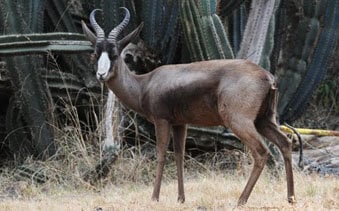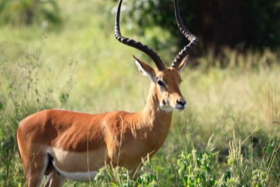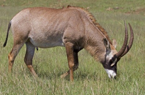 The sable is a rotund, barrel-chested antelope with a short neck, long face, and dark mane. Both males and females boast impressive ringed horns that rise vertically and curve backward. When they arch their necks and stand with their heads held high and tails outstretched, they resemble horses.